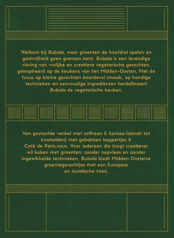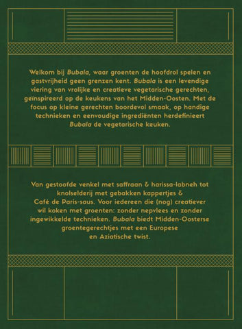 Welkom bij Bubala, waar groenten de hoofdrol spelen en gastvrijheid geen grenzen kent. Bubala is een levendige viering van vrolijke en creatieve vegetarische gerechten, geïnspireerd op de keukens van het Midden-Oosten. Met de focus op kleine gerechten boordevol smaak, op handige technieken en eenvoudige ingrediënten herdefinieert Bubala de vegetarische keuken. Van gestoofde venkel met saffraan & harissa-labneh tot knolselderij met gebakken kappertjes & Café de Paris-saus. Voor iedereen die (nog) creatiever wil koken met groenten: zonder nepvlees en zonder ingewikkelde technieken. Bubala biedt Midden-Oosterse groentegerechtjes met een Europese en Aziatische twist.