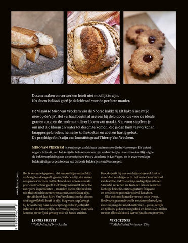 Met dit boek laat Miro Van Vreckem zien dat desem niet ingewikkeld hoeft te zijn. Stap voor stap brengt hij brood terug naar de oorsprong en bewijst hij dat iedereen dit kan: eerlijk, eenvoudig en puur, maar ook luxueus en verfijnd genoeg voor de haute cuisine.'