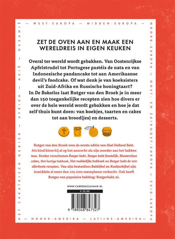 Overal ter wereld wordt gebakken. Van Oostenrijkse apfelstrudel tot Portugese pastéis de nata en van Indonesische pandancake tot aan Amerikaanse devil's foodcake. Of wat denk je van koeksisters uit Zuid-Afrika en Russische honingtaart? In De Bakatlas laat Rutger van den Broek je in meer dan 150 toegankelijke recepten zien hoe divers er over de hele gebakken wordt en hoe je dat zelf thuis kunt doen: van koekjes, taarten en cakes tot aan brood(jes) en desserts.