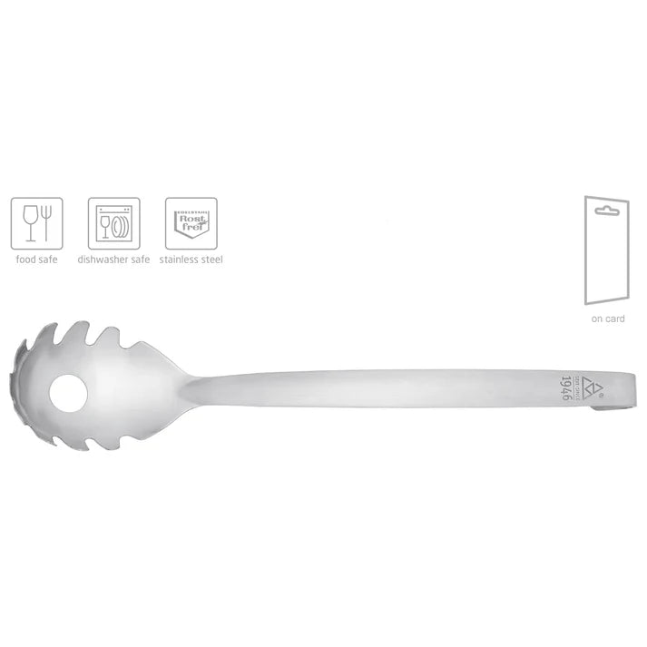 De robuust gevormde roestvrijstalen "1946" pasta / spaghetti lepel is voorzien van "vingers" om lange pasta zoals spaghetti uit de pan te scheppen. De lepel heeft een grote opening voor het afwateren.