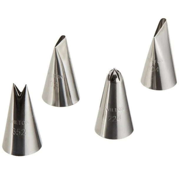 Versier en decoreer je cupcakes, taarten, cakes, koeken en andere baksels met deze spuitmondjes van het merk Wilton. In de set zitten vier verschillende spuitmonden om bloemblaadjes, schelpjes en prachtige toeven te maken. De spuitmonden passen op een standaard adapter en spuitzak, speciaal ontworpen voor eenvoudig gebruik. Een echte musthave voor in de keuken dus!